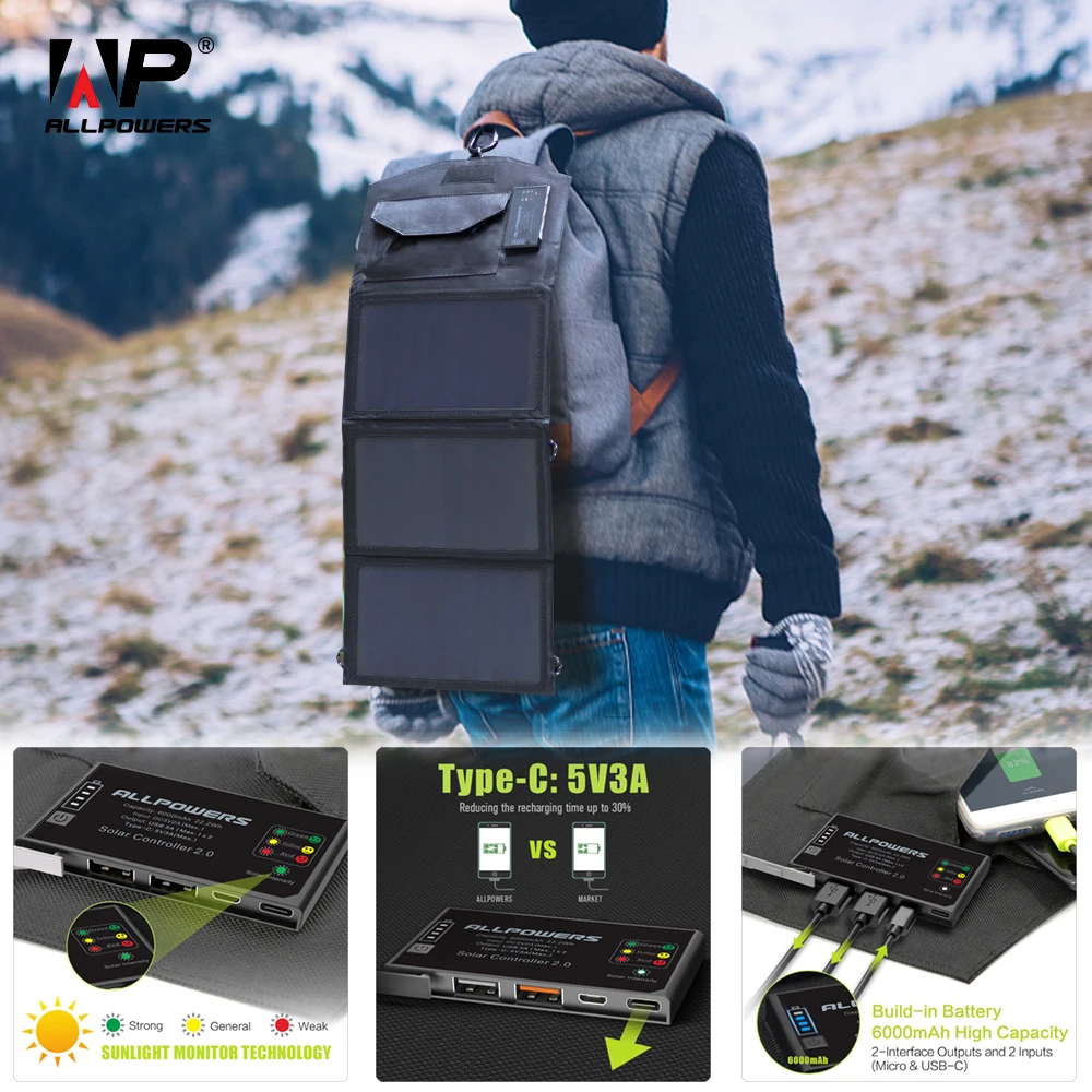 Big Deal ALLPOWERS Phone Charger 5V 15W Solar Battery Charger Dual USB and Type-C 5V 3A(Max.) Outdoors Solar